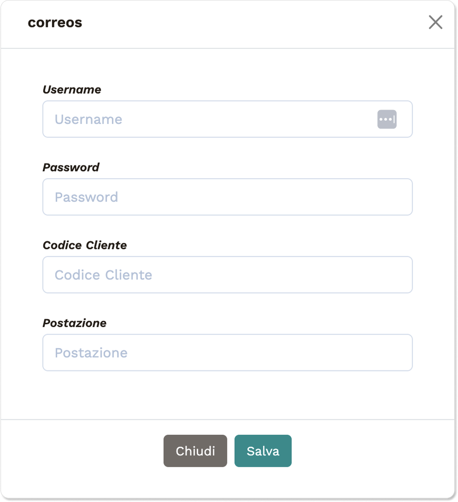 Si aprirà un pop-up in cui inserire le credenziali fornite da Correos: Username, Password, Codice Cliente, Postazione