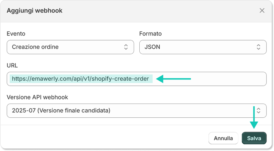 Infine, assicurati di impostare la Versione API Webhook selezionando la più recente disponibile. Attualmente, è consigliata la versione 2025-07 (Versione finale candidata), come visibile nell’interfaccia: