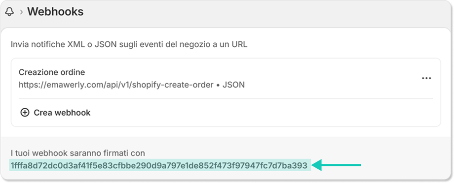 Una volta completata questa configurazione, manca solo un ultimo passaggio: il recupero della Webhook Signature, necessaria per ricevere automaticamente in Emawerly le notifiche relative agli ordini.