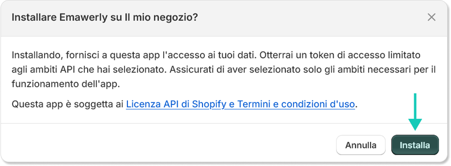 Nel popup che si apre, Shopify ti chiederà di confermare l’installazione dell’app personalizzata. Questa operazione serve ad attivare le credenziali di accesso necessarie per la connessione con Emawerly. Per procedere, clicca su “Installa” e attendi qualche secondo: al termine dell’operazione, le chiavi API saranno generate e visibili direttamente nella schermata.