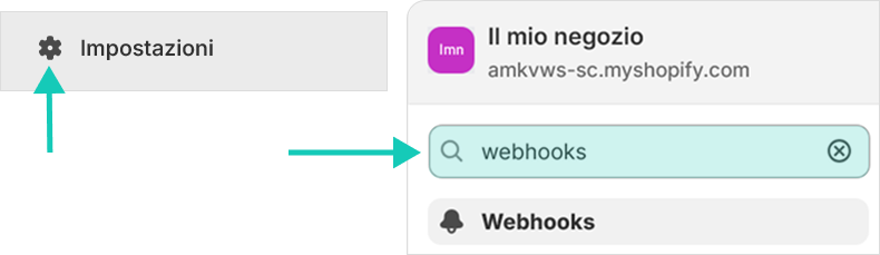 Dalla schermata principale del pannello Shopify, scorri verso il basso e clicca su Impostazioni, in basso a destra. Una volta entrato nella sezione impostazioni, utilizza la barra di ricerca in alto e digita “webhooks”. Tra i risultati, seleziona la voce corrispondente per accedere alla pagina dedicata.