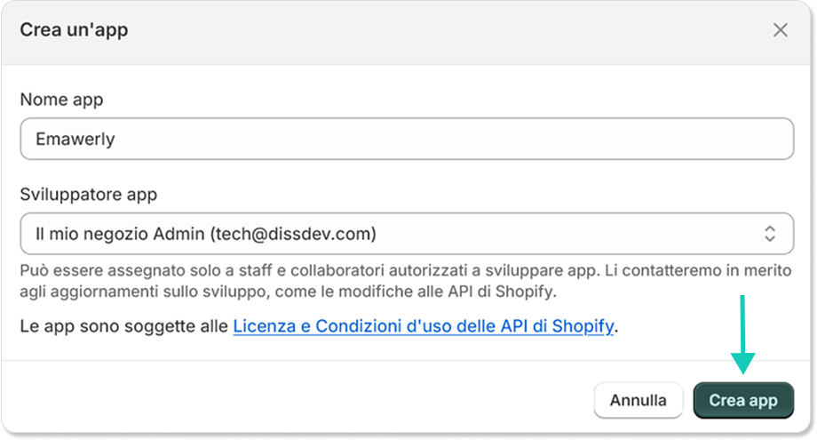 Clicca su Crea un'app , assegna un nome (ad esempio “Emawerly ”) e conferma per proseguire con la configurazione.