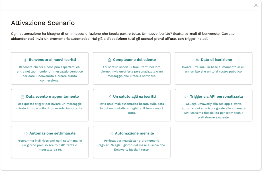 Se gli scenari predefiniti non coprono tutte le tue esigenze o desideri costruire automazioni complesse legate a eventi esterni (come azioni su app, CRM, ERP o altre piattaforme), puoi sfruttare la potenza del Trigger via API personalizzata.